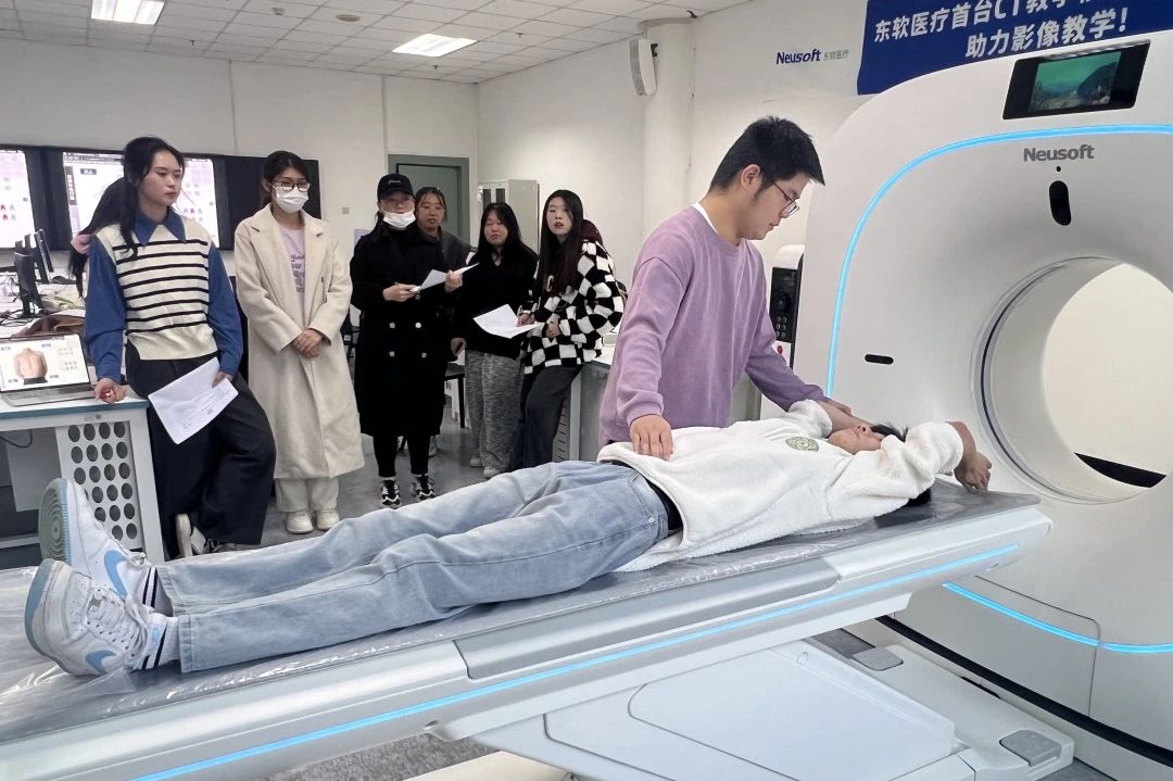球盟会(中国)教育与大连球盟会(中国)信息学院、大连睿康心血管病医院联合打造的“早临床、多临床”沉浸式教学模式成为课程的另一大亮点。在掌握理论知识后,学生们在医院医学影像技术CT实训室,顺利获得影像科医师的指导,可实时观摩增强CT检查的全流程操作,帮助学生将课堂所学与实际操作紧密结合,有效提升学生的临床思维能力和实际操作技能。